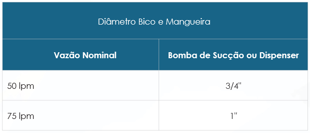 *A vazão nominal é um valor de referência. Esse fluxo é alcançado em condições ideais de laboratório, com pressão (altitude) e temperatura controladas, sem considerar o uso de acessórios como swivel, breakaway e outros. A vazão atingida quando a bomba é instalada depende de outros fatores como: método e dispositivos empregados para realizar a medição da vazão real, tipo de combustível, distancia tanque-bomba, profundidade do tanque (se for tanque subterrâneo), diâmetro da tubulação de sucção, temperatura ambiente, altitude do local de instalação, se o filtro interno da unidade bombeadora está ou não limpo, se existe filtro de linha ou outro tipo externo na instalação e o estado dos respectivos elementos filtrantes e dos acessórios eventualmente existentes (como swivel e breakaway). No caso de soluções de abastecimento que utilizam dispensers e bombas submersas, a potência e a quantidade de dispensers conectados à mesma bomba submersa também são fatores que influenciam os resultados obtidos.
