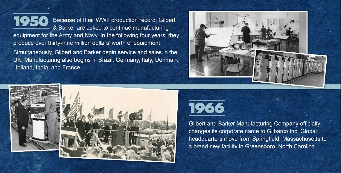 - Gilbert and Barker Manufacturing Company officially changes its corporate name to Gilbarco.