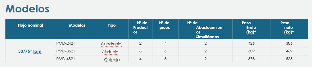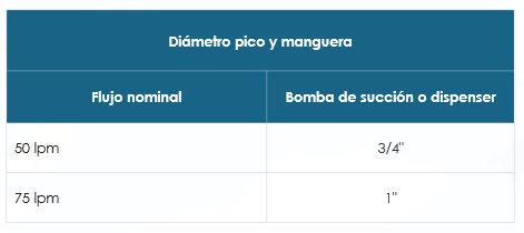 *El caudal nominal es un valor de referencia. Este caudal se logra en condiciones ideales de laboratorio, con presión (altitud) y temperaturas controladas, sin considerar el uso de accesorios como swivel, breakaway y otros. El caudal que se alcanza cuando se instala la bomba depende de otros factores como: método y dispositivos utilizados para medir el caudal real, tipo de combustible, distancia tanque-bomba, profundidad del tanque (si es subterráneo), diámetro de la tubería de aspiración, temperatura ambiente, altitud del lugar de instalación, si el filtro interno del grupo de bombeo está limpio o no, si existe un filtro de línea u otro tipo externo en la instalación y el estado de los respectivos elementos filtrantes y accesorios que lo requieran. puede estar presente (como giro y desprendimiento). En el caso de soluciones de abastecimiento que utilizan surtidores y bombas sumergidas, la potencia y el número de surtidores conectados a una misma bomba sumergida también son factores que influyen en los resultados obtenidos.